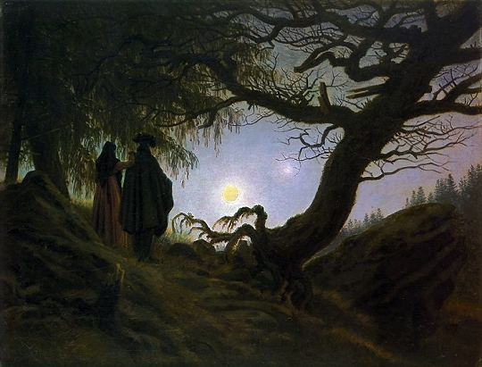 "Romantically dark." What a wonderful phrase. Torrid has always possessed an artistic side, and it's wonderful to see it exhibited in this cover. Romantic darkness is a natural compliment to the bright, springtime beauty for which Torrid is so well known. Let's not forget that the sunlit Neoclassicism of the first half of the 18th century led directly into the Gothic Revival in art and literature of the second half--which, in turn, developed into the full-blown Romanticism of the 19th century. For those who are not well acquainted with the Romantic movement . . . you don't know what you're missing. Oskar Wälzel's seminal study titled German Romanticism (1932) provides a useful introduction: The solitude and enchantment of the forest, the rushing mill-stream, the nocturnal stillness of the German village, the cry of the night watchman, splashing fountains, palace ruins and a neglected garden in which weatherbeaten statues crumble, the fragments of a demolished fortress, everything that creates the yearning to escape from the monotony of daily life is Romantic. This yearning lured the German Romanticist not only to distant realms but also to peculiarly native customs, to old German art and manners . . . Though he cast his eyes upon the glories of the past, the Romanticist nevertheless heralded a spiritually quickened golden age of the future . . . Hard upon the glorification of death and the world beyond came the brisk, clear call to the joyous life of actual deeds, to vigorous self-contemplation, and to eager activity on behalf of humanity. Note the emphasis on using the artworks of the past as a source of inspiration in creating a "golden age of the future." As we have discussed before, this practice is characteristic of the "New Femininty" in fashion. Here are a few representative examples of "Romantic darkness," for those who have a taste for such things. This short but haunting lyric by Ludwig Uhland is titled "The Hostess's Daughter (1809): Three students had cross'd o'er the Rhine's dark tide; Marvellous, no? The idea of a love so powerful that it transcends death itself was one of the staple themes of Gothic Romanticism, and it lived on into the Victorian age, in works like Bronte's Wuthering Heights. But perhaps the most famous example of a "midnight rendezvous" is Gottfried Bürger's famous ballad Leonore (1773), which is linked at the bottom of this post. The early date is significant, as this was one of the first truly influential examples of Neo-Gothic literature. Its appearance sent shockwaves throughout the rational, ordered world of the 18th century. It is a narrative poem, and, as such, a tad longer than a lyric. Therefore, when you read it, try to do so in one complete sitting, late at night, by the light of a single tallow candle, with the wind whispering outside your open lattice. You will be glad that you did. Caspar David Friedrich, Man and Woman Contemplating the Moon (1830–35): ![]()
